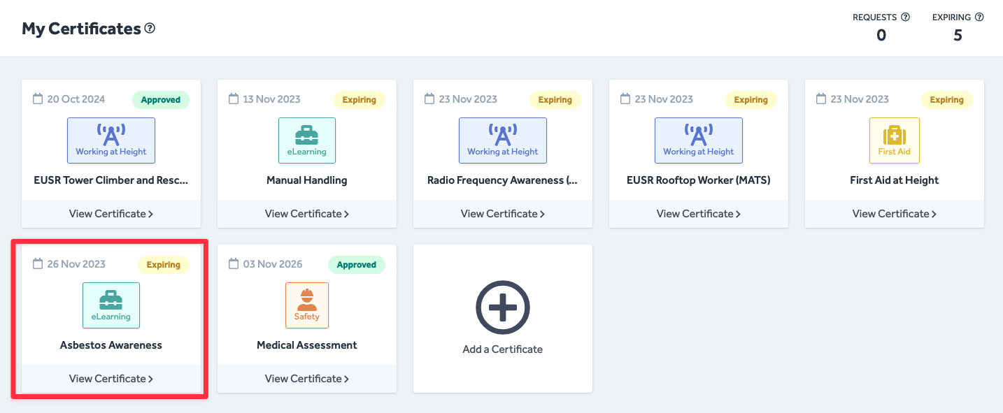 - Here, you will find all your certificates laid out in tiles with colour-coded flags to show their status.