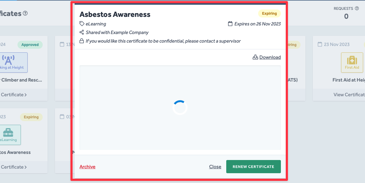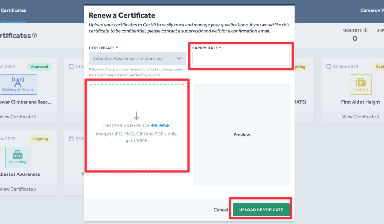 As a Certifi user, your certificates must be valid to ensure you are compliant to work. To renew an expired or expiring certificate, follow these steps: