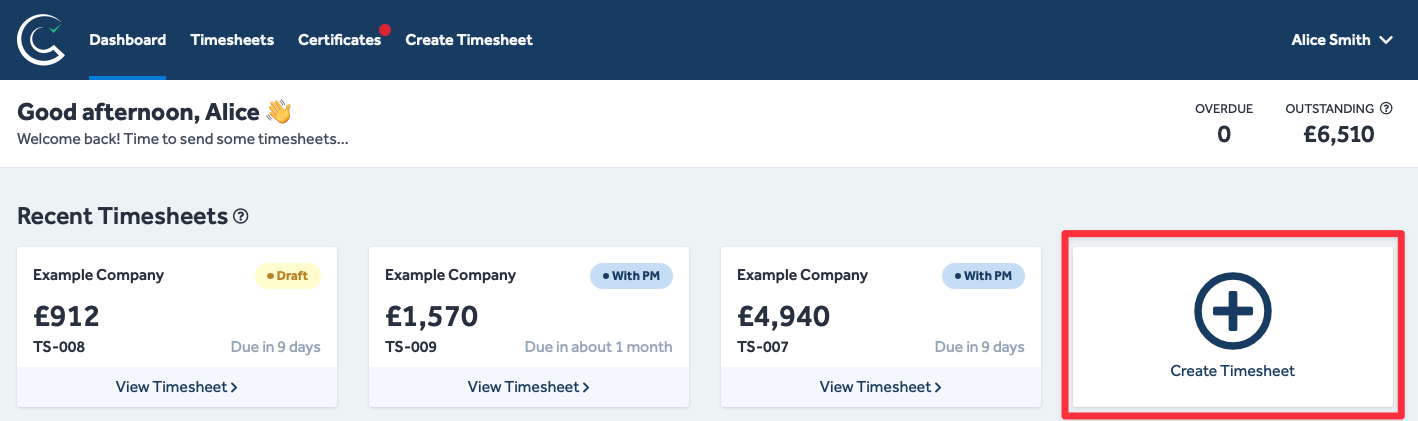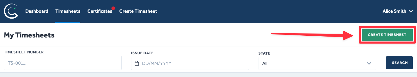 - Navigate to either the Dashboard or Timesheets tab from any Certifi page.