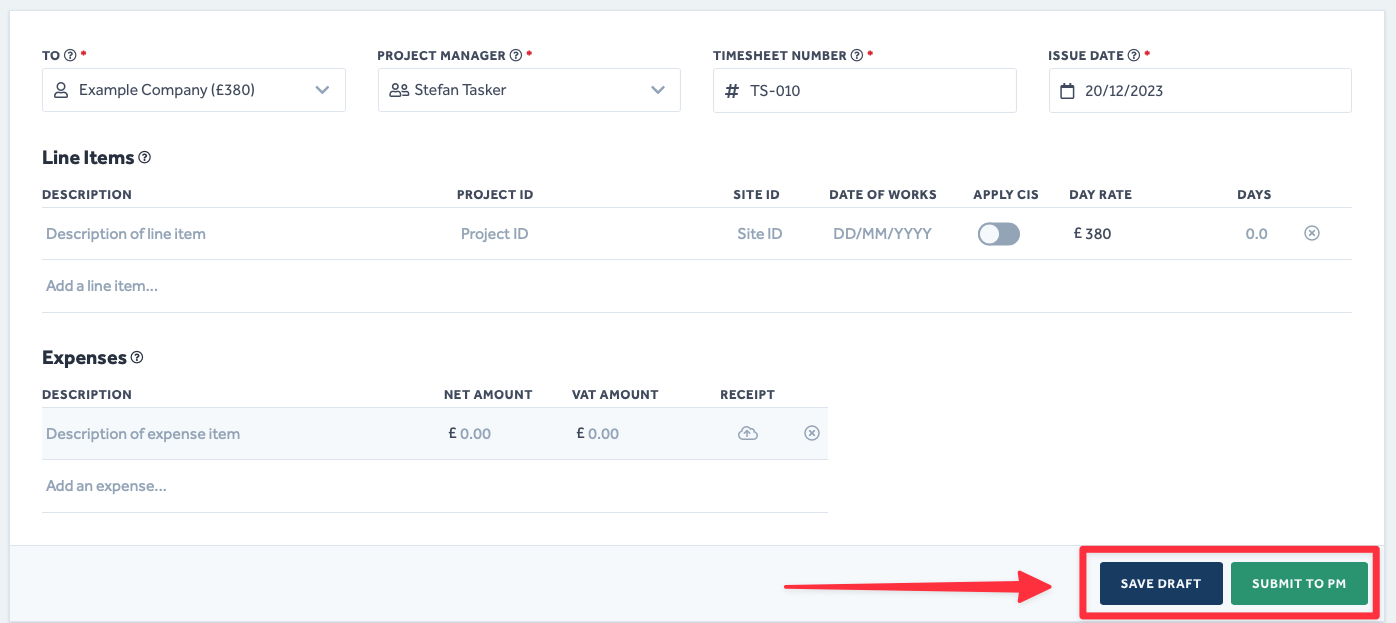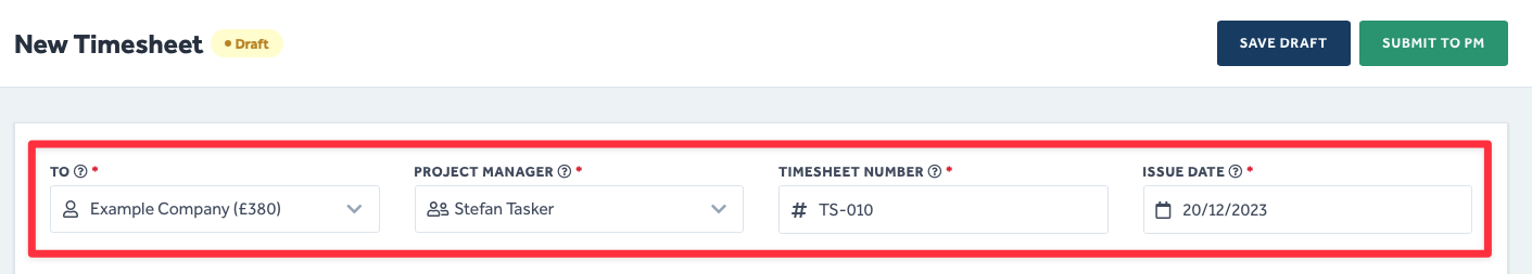 - This will open a New Timesheet page and automatically apply the Draft state to it whilst you edit the information.