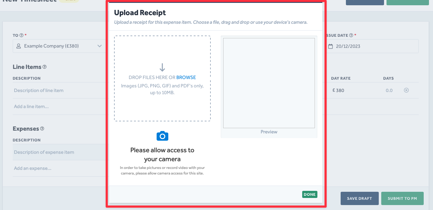 - Click Done once you have uploaded an appropriate image file, and you will be returned to your timesheet.