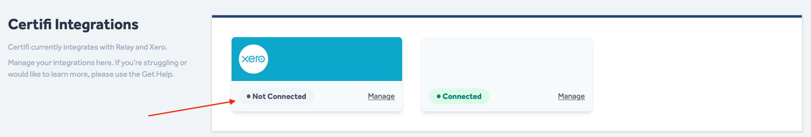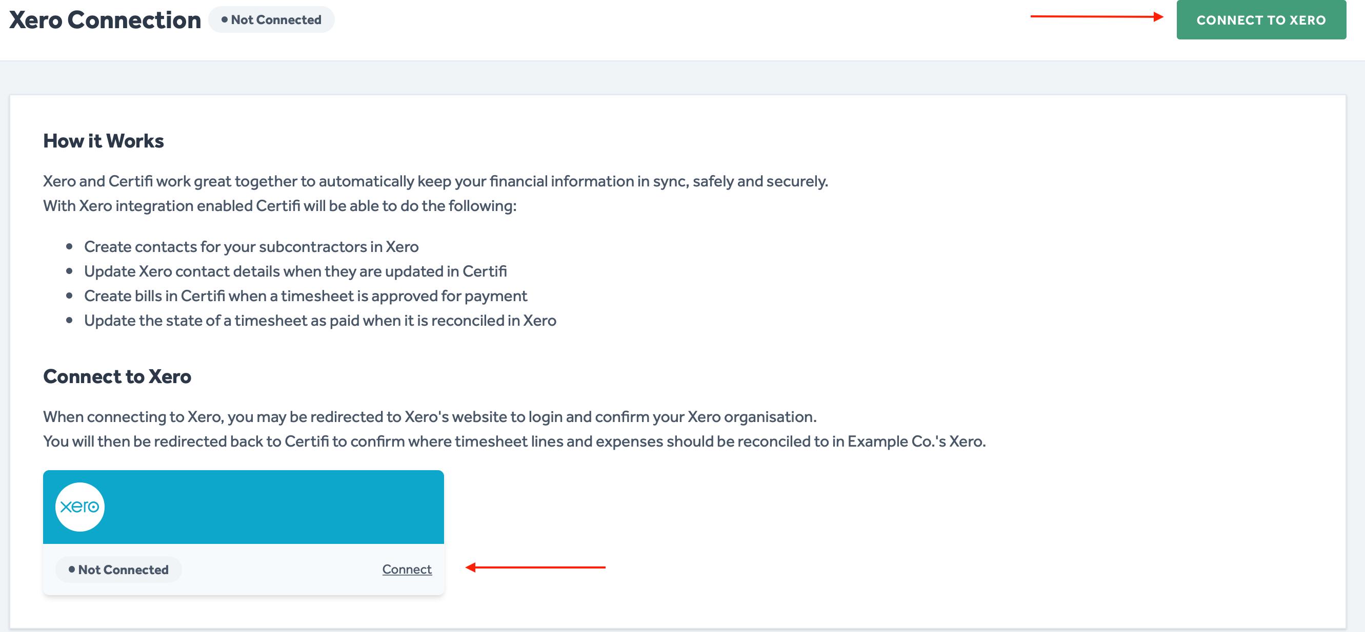 Once connected, the Manage Xero card on the Certifi Company Settings page will read Connected. At this point, once any timesheet is marked as Approved For Payment, it will appear in your chosen Xero account as a Bill. Once these bills have been reconciled as paid in Xero, the integration will automatically update the timesheet's state in Certifi to Paid.