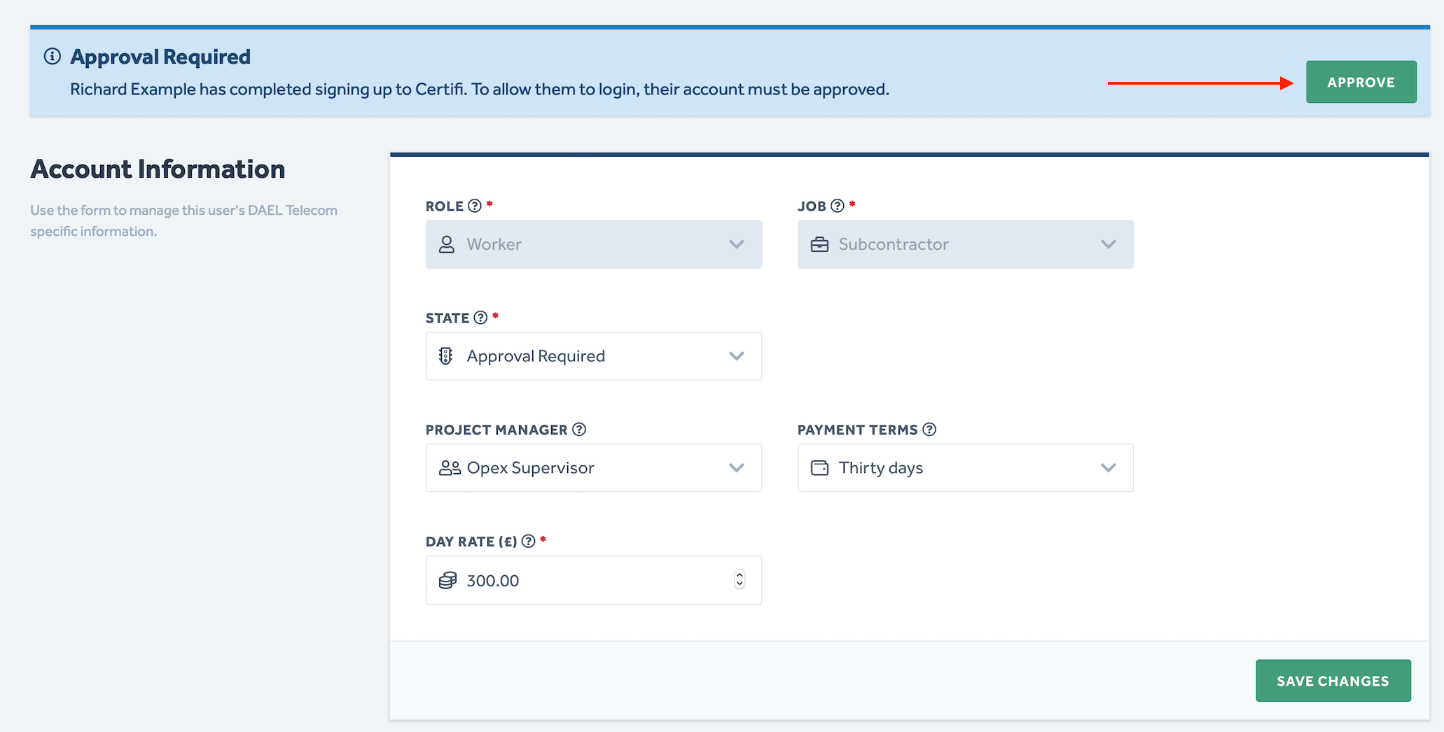 - Here, you can review their company details and make sure they are correct before clicking Approve.