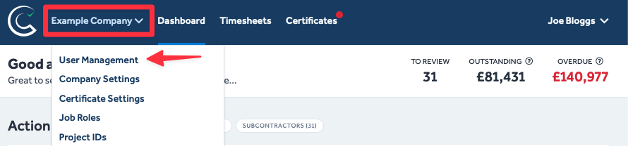 - Navigate to the User Management page by clicking on your company name (in the page's header) and then selecting User Management from the drop-down list.