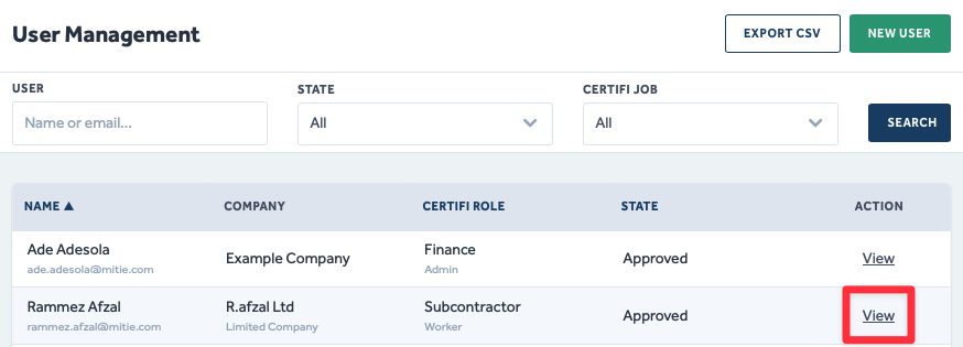 - Once in the User Management menu, select View on the line of the user you wish to remove.