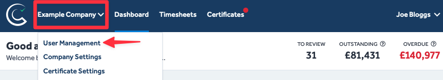 - Navigate to the User Management page by clicking on your company name (in the page's header) and then selecting User Management from the drop-down list.