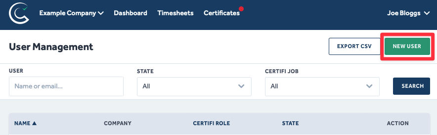 - Click on New User in the top right (in the current Certifi version, this is now a circle with 3 dots in it).