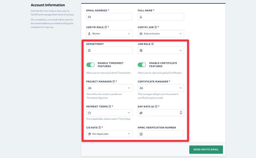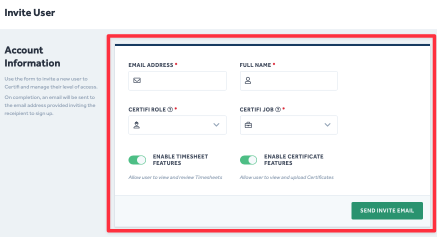 - Once you are happy with the information entered, click Send Invite Email.