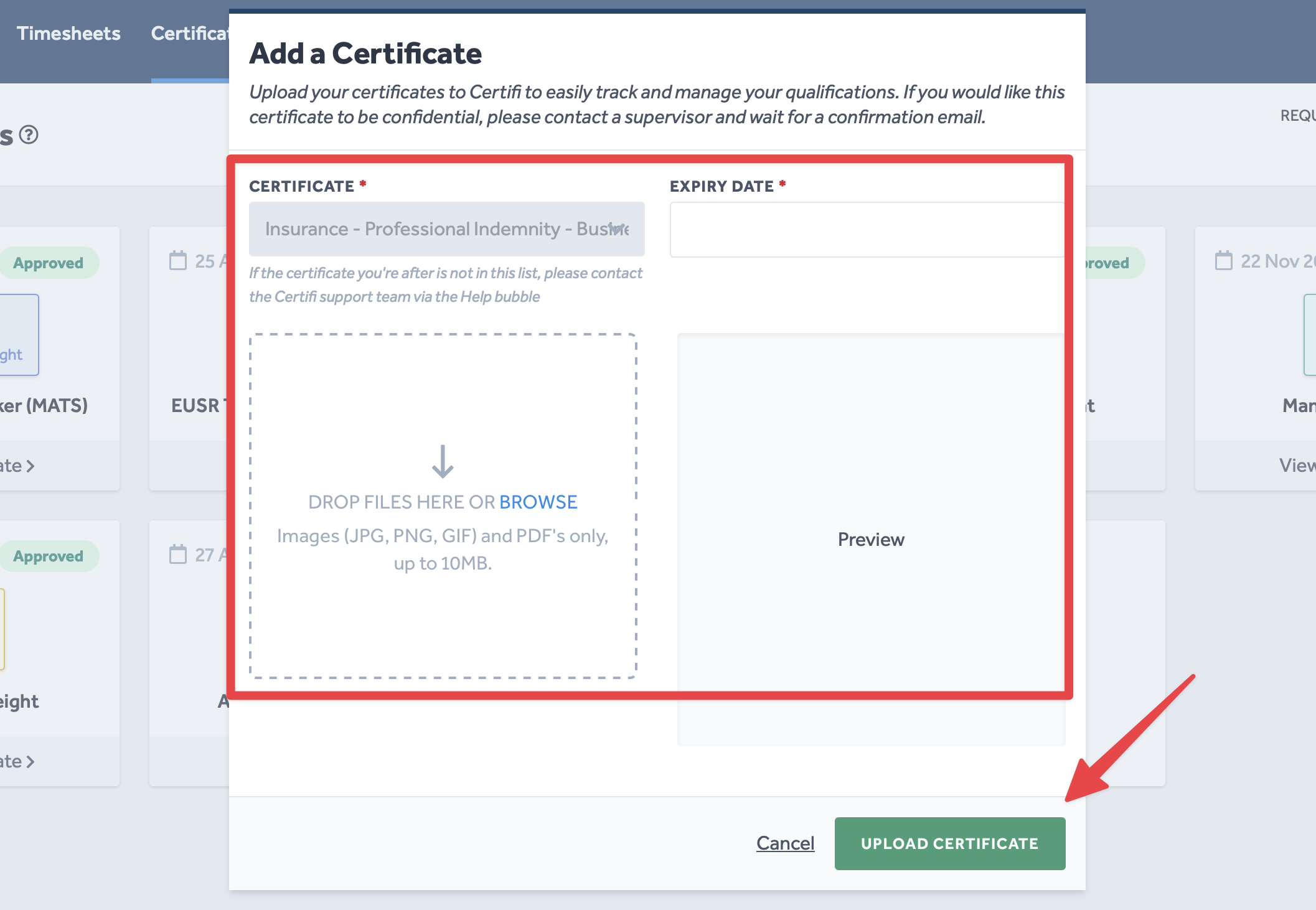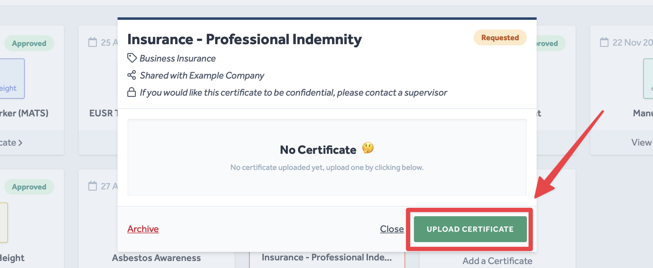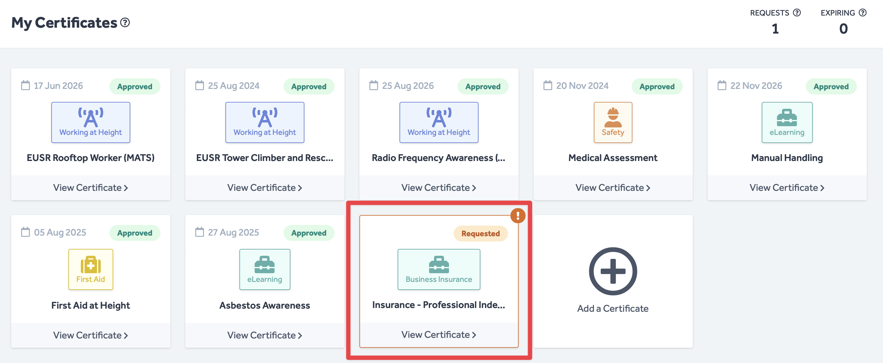 If you are lacking an important certificate, an Admin user may manually request that you upload it to your Certifi profile. To respond to one of these certificate requests, follow these steps: